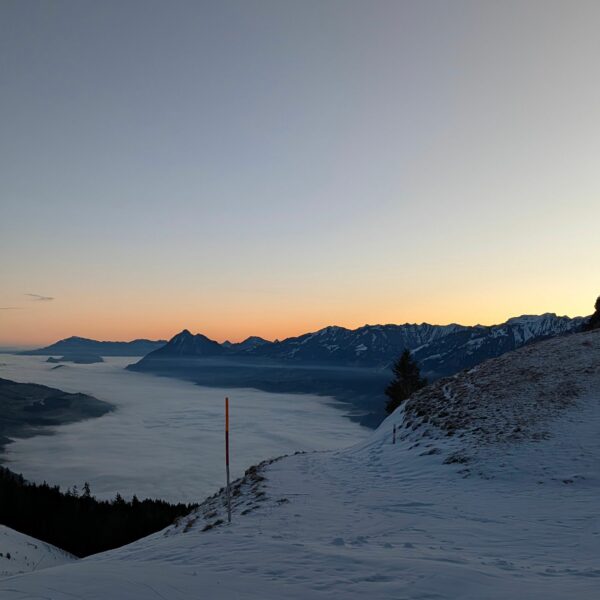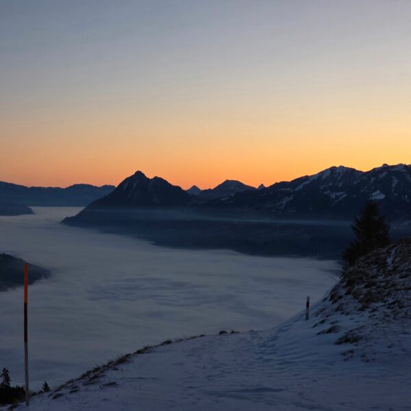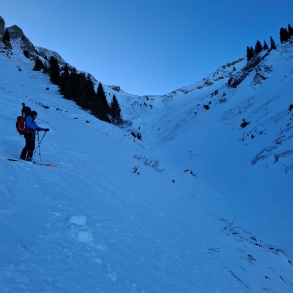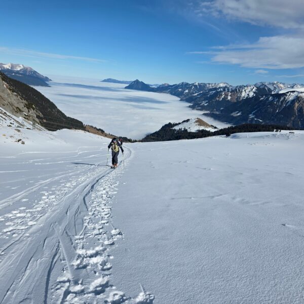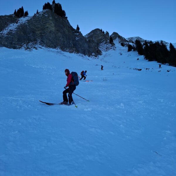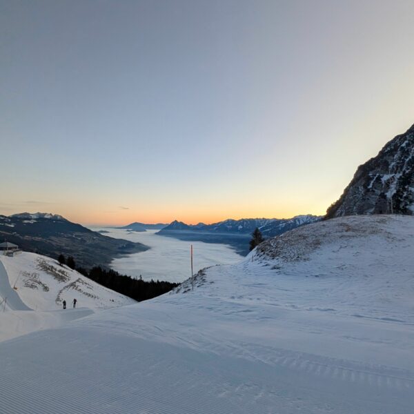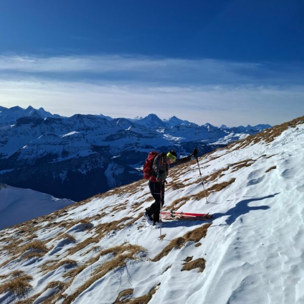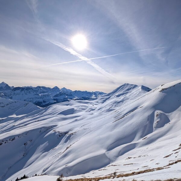Aufbruch auf der Mörlialp im Dunkeln, doch schon bald tagte es und ein wunderprächtiger Tag kündigte sich an. Via Niederen zog es uns Richtung Biet. Einfahrt in die Wandelen und es gab ein paar schöne Bögen. Unten raus besser als erwartet und gut fahrbar trotz des wenigen Schnees. Am oberen Arni vorbei konnten wir endlich die Sonne geniessen und dutzende Gemschi bewundern. Auch die Abfahrt vom Arnihagä war ganz passabel und bis runter ins Arnischwand lag eine geschlossene Schneedecke. Zum Wiederaufstieg am Jänzi vorbei musste noch Motivation getankt werden, jedoch wurde dies super gemeistert, ja sogar so gut, dass noch ein Dessert drinlag. So ging es weiter zur Chringä mit kurzer Abfahrt und Mandli. In den Nordhang durften wir noch ein paar Bögen zeichnen, ehe wir via Niederen zum wohlverdienten Bier in der Bully Bar gelangten. Heja, alle super gemacht und wemmä nid ufä Wäg ghat chamä nid wissä wies wär wemmä ufä Wäg wurd!