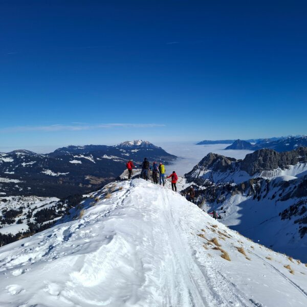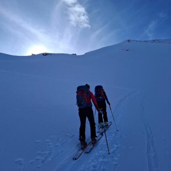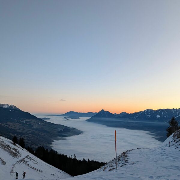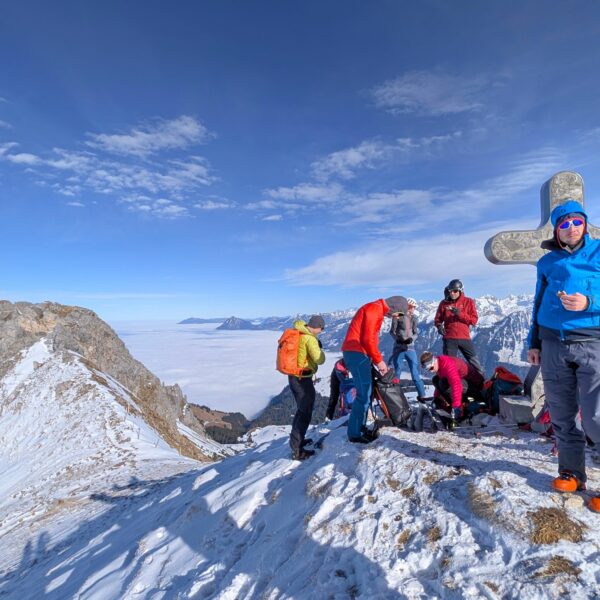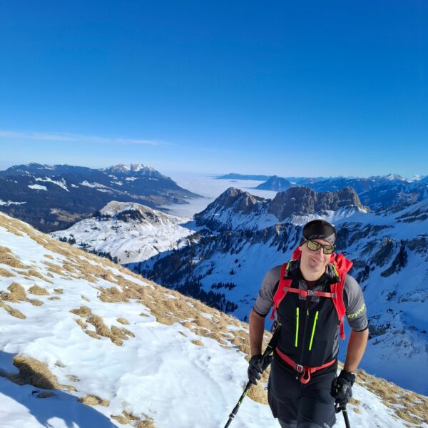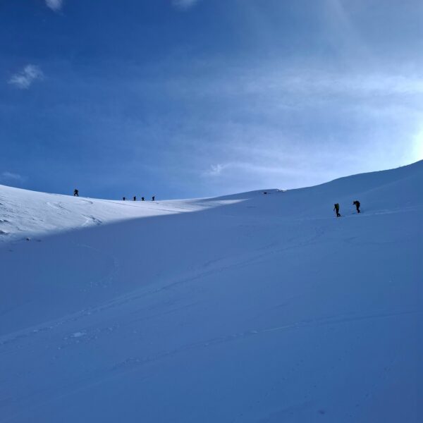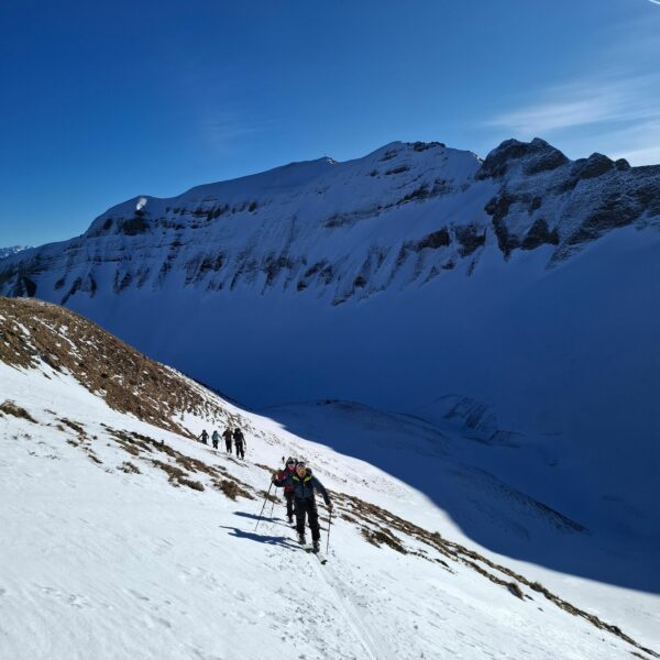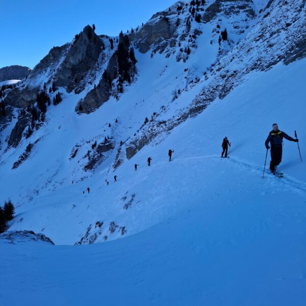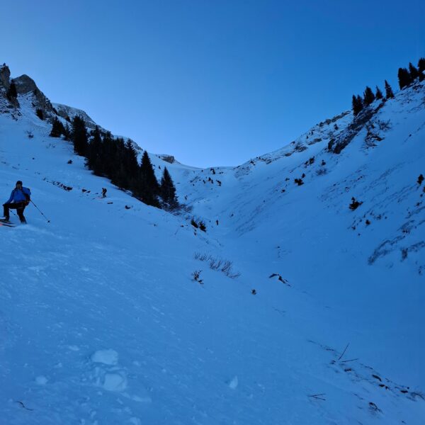Aufbruch auf der Mörlialp im Dunkeln, doch schon bald tagte es und ein wunderprächtiger Tag kündigte sich an. Via Niederen zog es uns Richtung Biet. Einfahrt in die Wandelen und es gab ein paar schöne Bögen. Unten raus besser als erwartet und gut fahrbar trotz des wenigen Schnees. Am oberen Arni vorbei konnten wir endlich die Sonne geniessen und dutzende Gemschi bewundern. Auch die Abfahrt vom Arnihagä war ganz passabel und bis runter ins Arnischwand lag eine geschlossene Schneedecke. Zum Wiederaufstieg am Jänzi vorbei musste noch Motivation getankt werden, jedoch wurde dies super gemeistert, ja sogar so gut, dass noch ein Dessert drinlag. So ging es weiter zur Chringä mit kurzer Abfahrt und Mandli. In den Nordhang durften wir noch ein paar Bögen zeichnen, ehe wir via Niederen zum wohlverdienten Bier in der Bully Bar gelangten. Heja, alle super gemacht und wemmä nid ufä Wäg ghat chamä nid wissä wies wär wemmä ufä Wäg wurd!